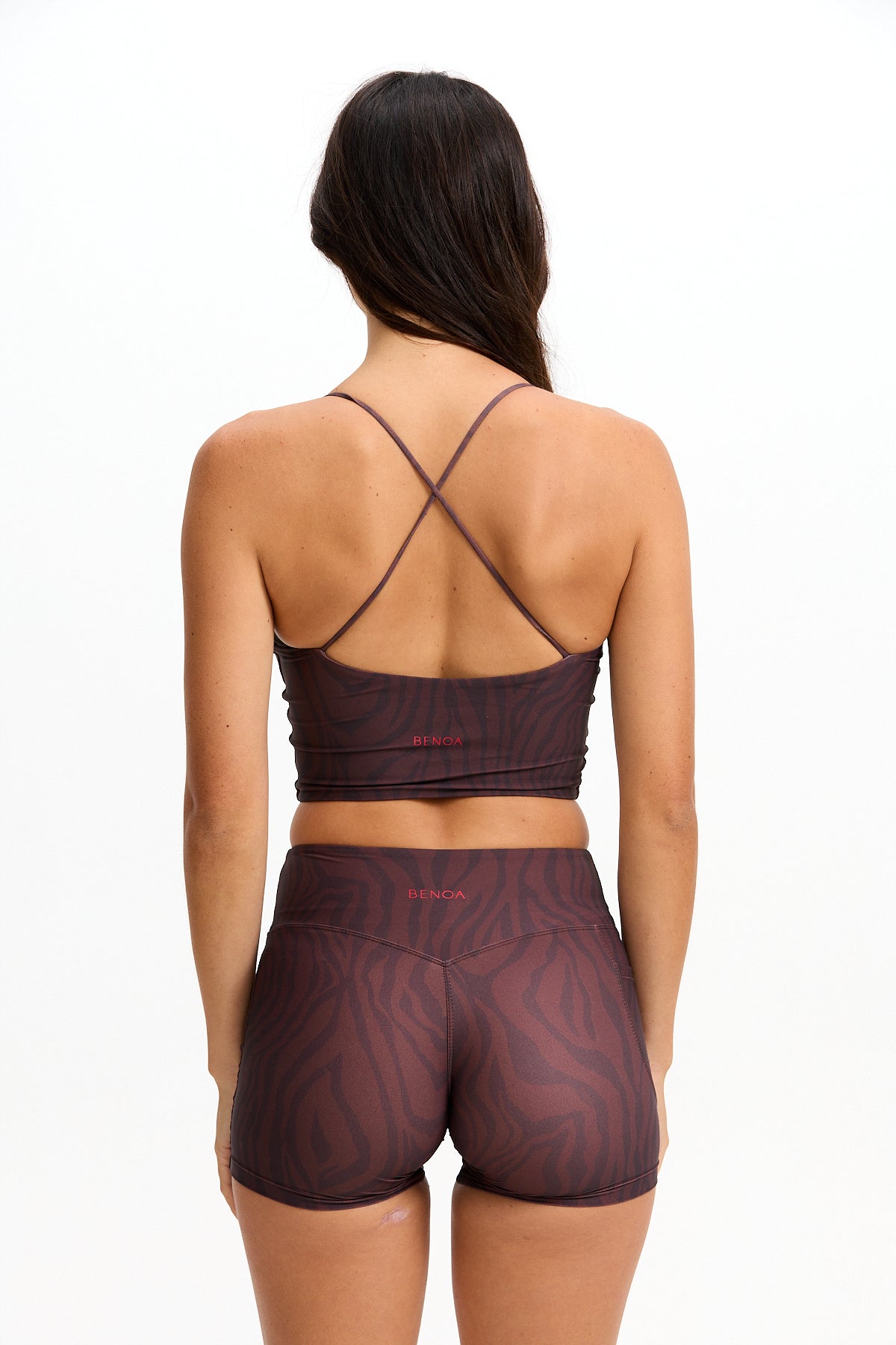 This medium length tank features a slightly scooped neckline, with fixed, round crossback details and a mid-scoop back. It is double lined with a flatlay inside seam detail to keep in place while you’re moving.